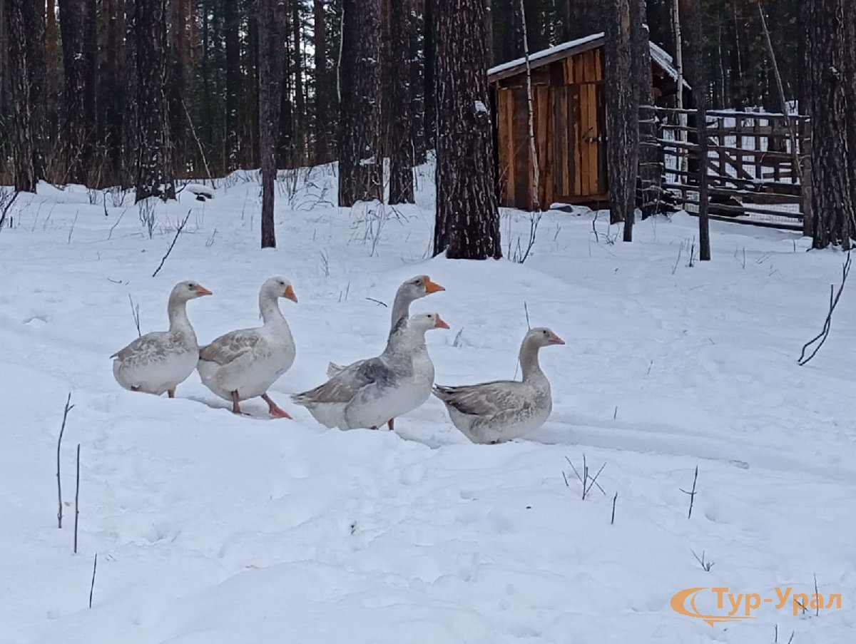 Также в парке проживают животные: северные олени, козлик Рома, чёрный ворон, гуси! Они очень любят яблоки и морковку!
